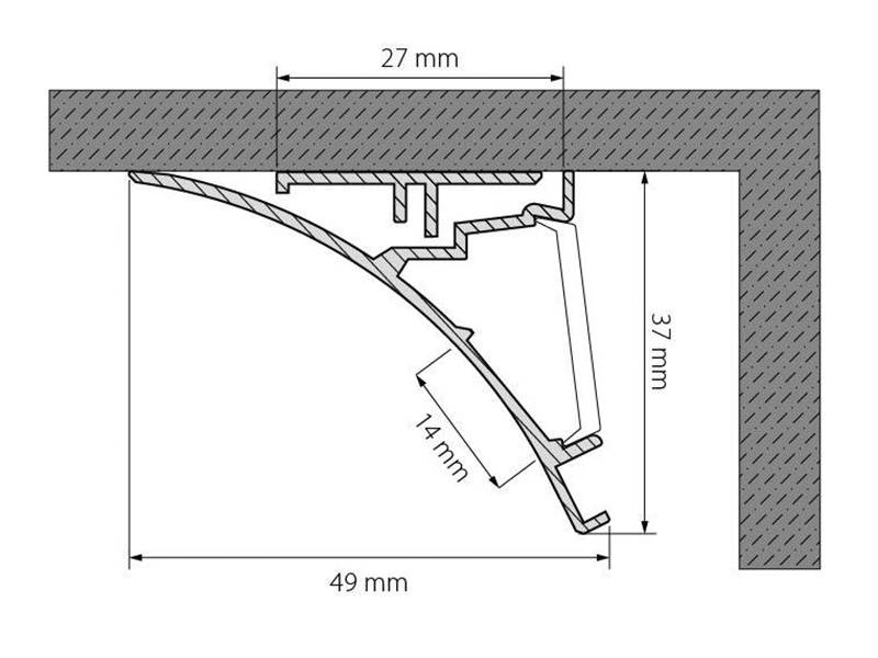Габаритные размеры (L×W×H): 2000 x 49 x 37 мм. Ширина площадки для ленты 14 мм.