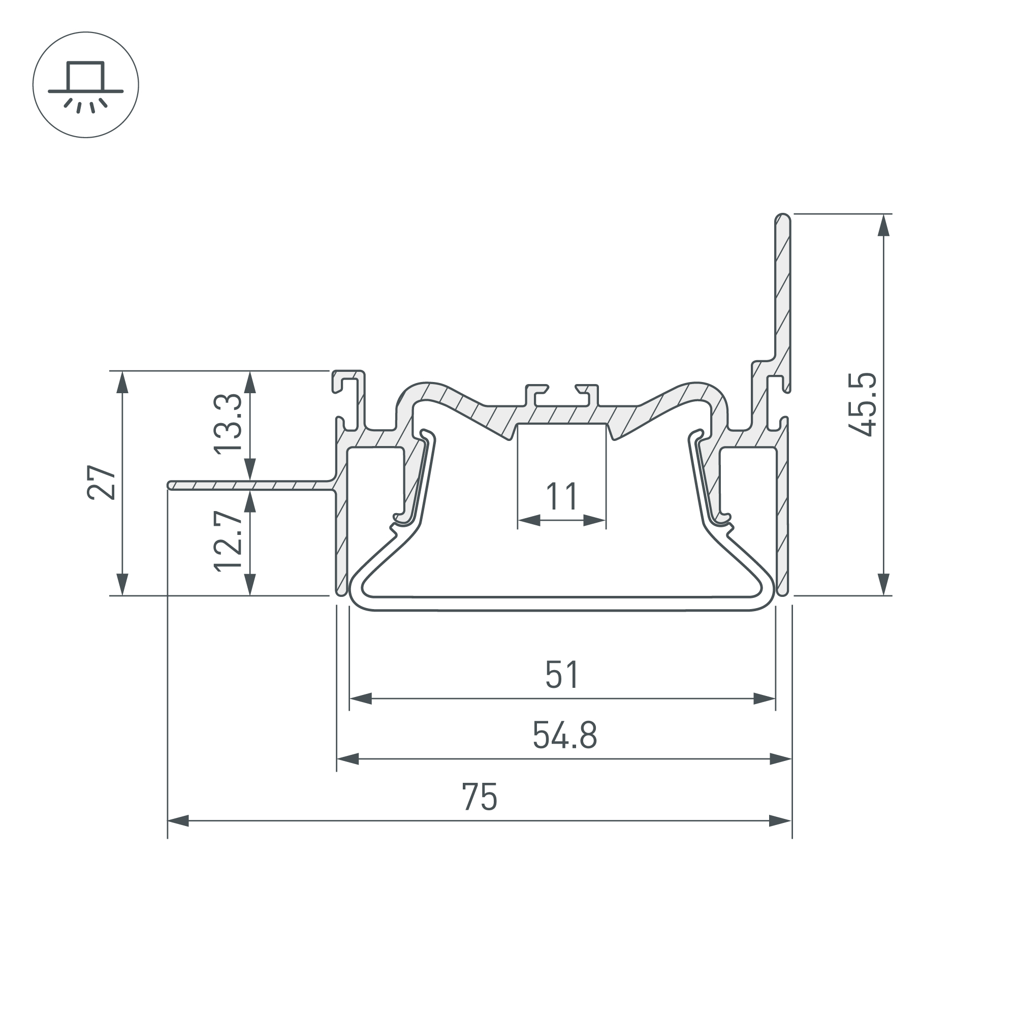 Габаритные размеры (L×W×H): 2000 x 75 x 55 мм. Ширина площадки для ленты 11 мм.