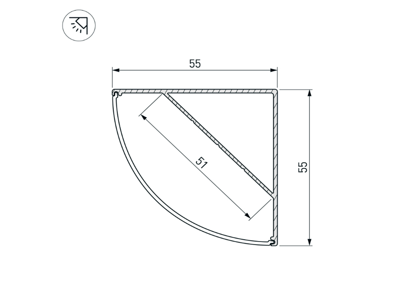 Габаритные размеры профиля составляют 2000 мм в длину, 55 мм в ширину и 55 мм в высоту. Площадка для установки светодиодных лент позволяет использовать ленту шириной до 51 мм и мощностью до 49 Вт/м. Это обеспечивает гибкость в выборе светодиодных лент и создает потрясающие световые решения.