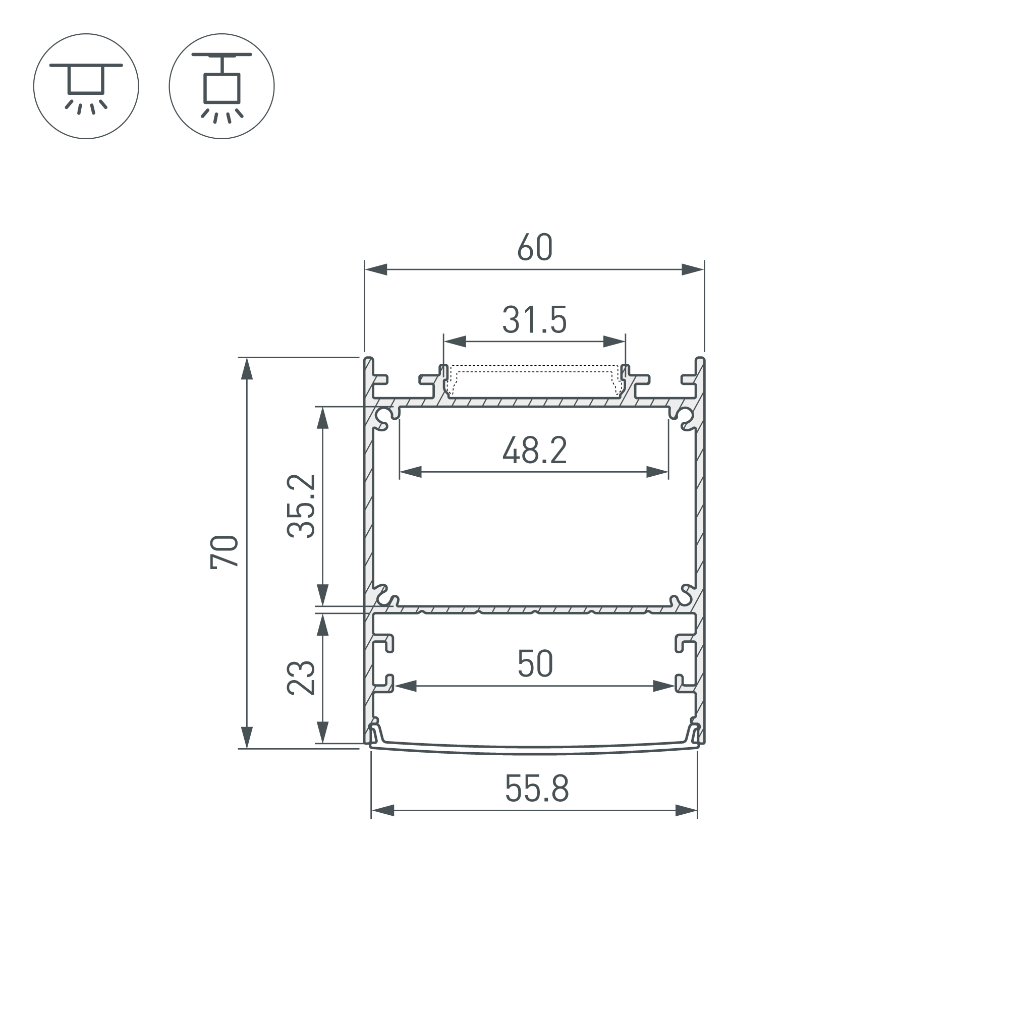 Габаритные размеры профиля составляют 2000 мм в длину, 60 мм в ширину и 70 мм в высоту. Площадки для установки светодиодных лент позволяют использовать ленты шириной до 50 мм и 31,5 мм (отраженный свет) и общей мощностью до 67 Вт/м. Это обеспечивает гибкость в выборе светодиодных лент и создает потрясающие световые решения.