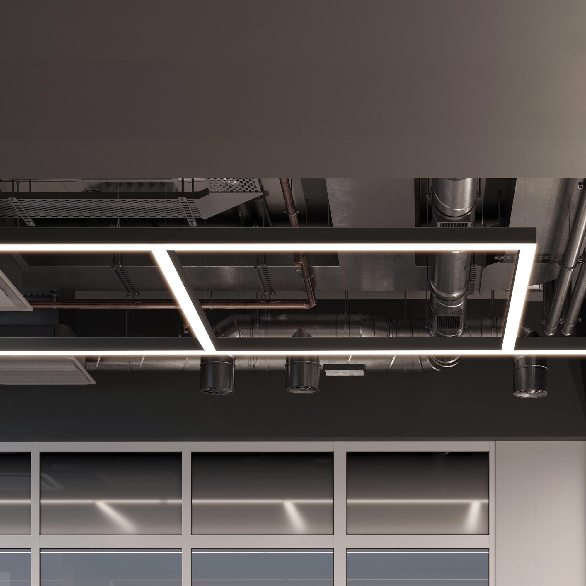 Подвесной профиль из анодированного алюминия черного цвета с отсеком для блока питания (48,2х35,2 мм) с двусторонним свечением для создания эффекта «отраженного света» идеально подходит для основного освещения помещений.