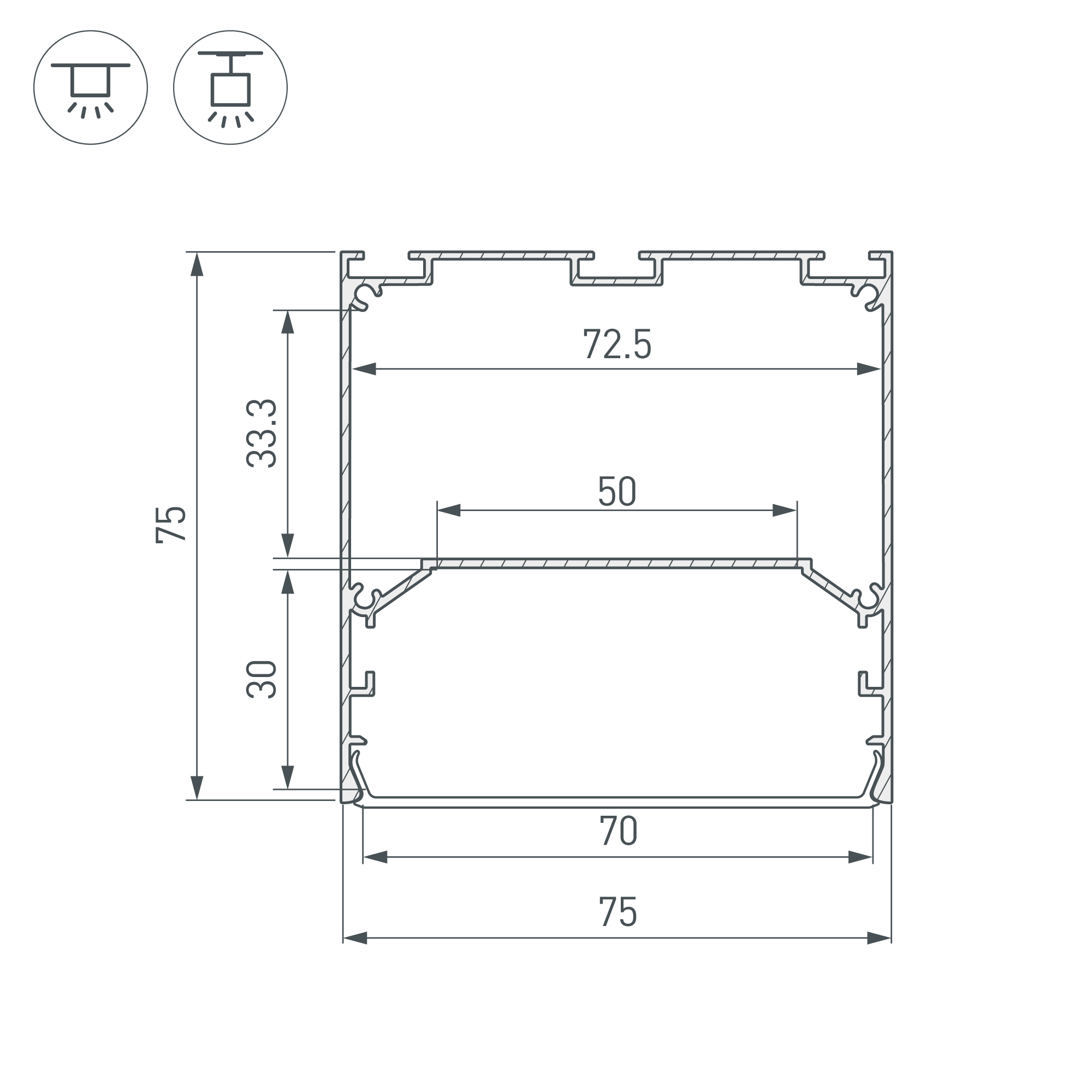 Габаритные размеры профиля составляют 2500 мм в длину, 75 мм в ширину и 75 мм в высоту. Площадка для установки светодиодных лент позволяет использовать ленту шириной до 50 мм и мощностью до 78 Вт/м. Это обеспечивает гибкость в выборе светодиодных лент и создает потрясающие световые решения.