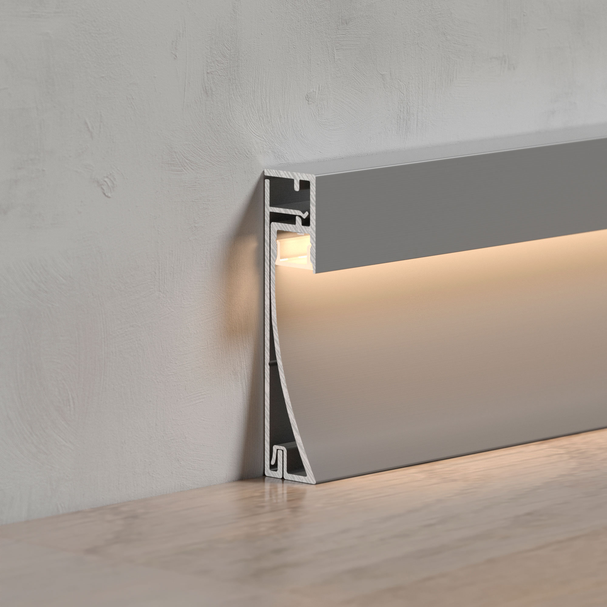 Накладной двухкомпонентный профиль-плинтус из анодированного алюминия для контурной подсветки помещения. Габаритные размеры этого профиля составляют 2000 мм в длину, 12,2 мм в ширину и 53,3 мм в высоту. Площадка для установки светодиодных лент позволяет использовать ленту шириной до 8 мм и мощностью до 20 Вт/м. Это обеспечивает гибкость в выборе светодиодных лент и создает потрясающие световые решения.