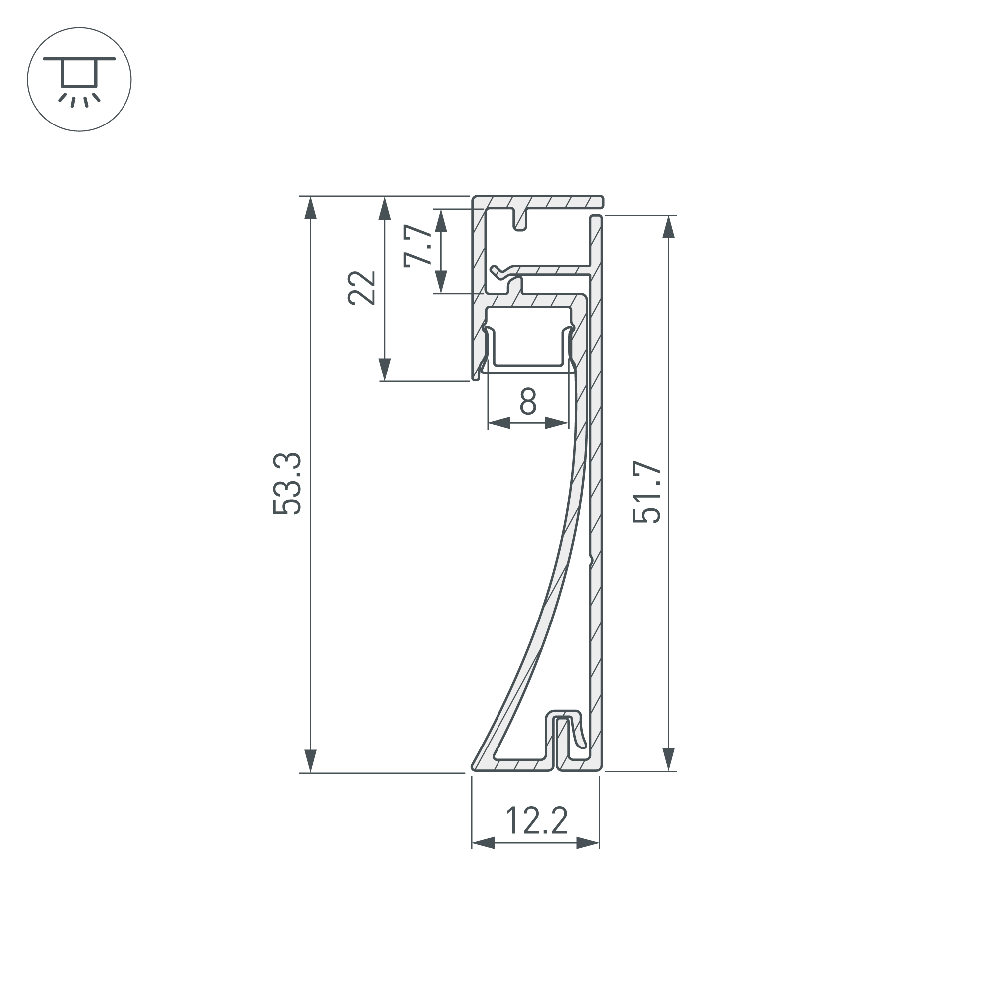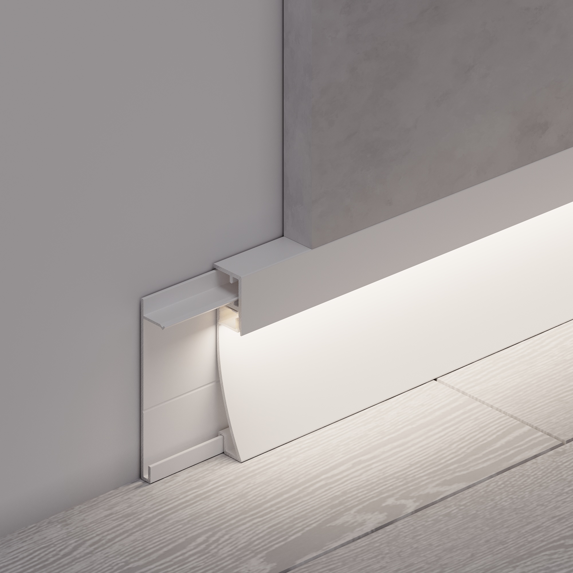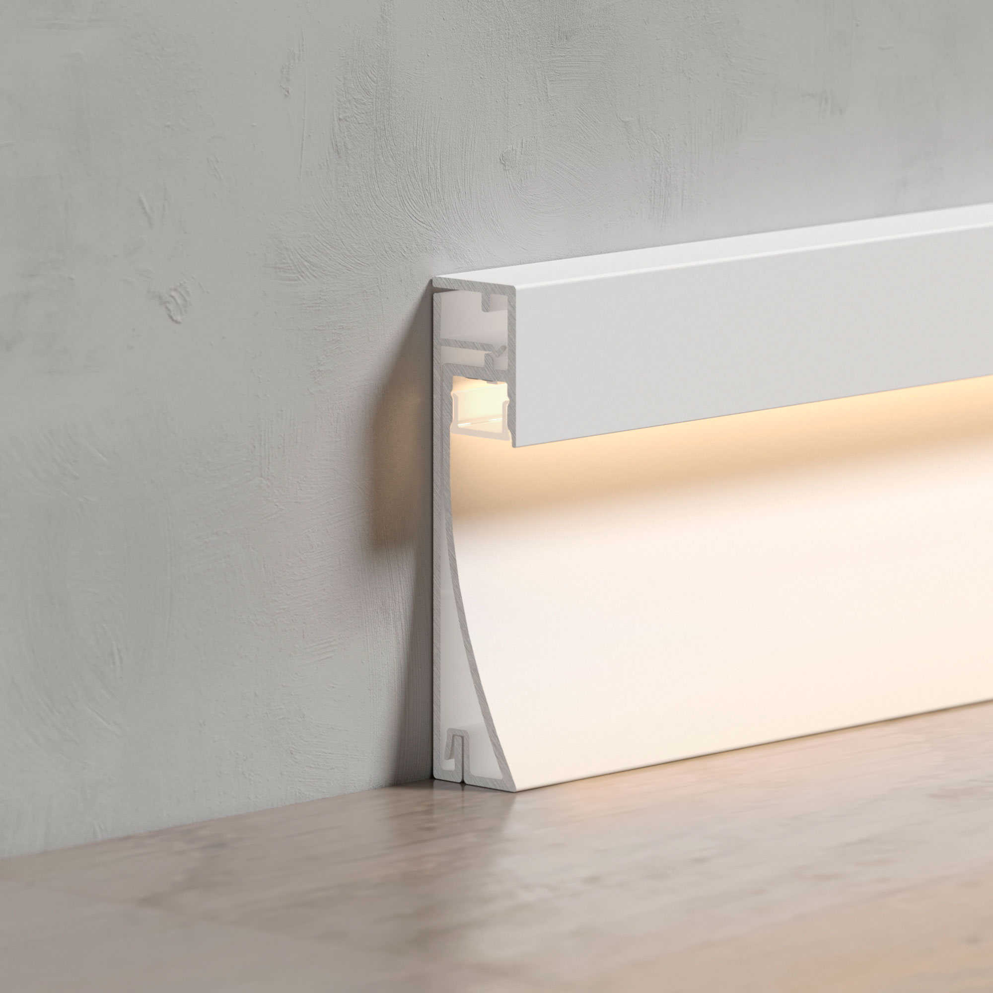 Накладной двухкомпонентный алюминиевый профиль-плинтус белого цвета для контурной подсветки помещения. Габаритные размеры этого профиля составляют 2000 мм в длину, 12,2 мм в ширину и 53,3 мм в высоту. Площадка для установки светодиодных лент позволяет использовать ленту шириной до 8 мм и мощностью до 20 Вт/м. Это обеспечивает гибкость в выборе светодиодных лент и создает потрясающие световые решения.
