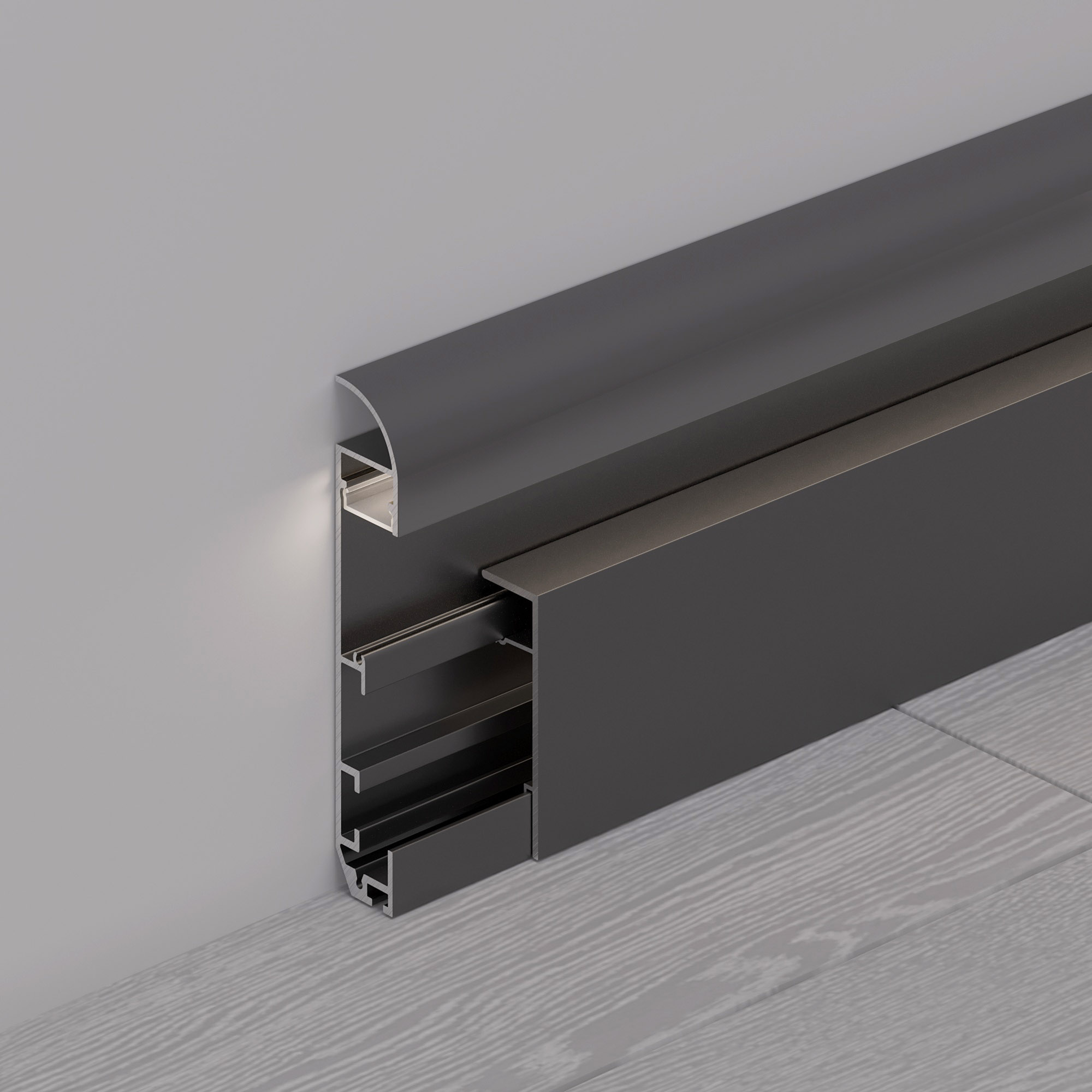 Накладной двухкомпонентный алюминиевый профиль-плинтус с кабель-каналом черного цвета для контурной подсветки помещения. Габаритные размеры этого профиля составляют 2000 мм в длину, 14,8 мм в ширину и 79,7 мм в высоту. Площадка для установки светодиодных лент позволяет использовать ленту шириной до 8 мм и мощностью до 20 Вт/м. Это обеспечивает гибкость в выборе светодиодных лент и создает потрясающие световые решения.