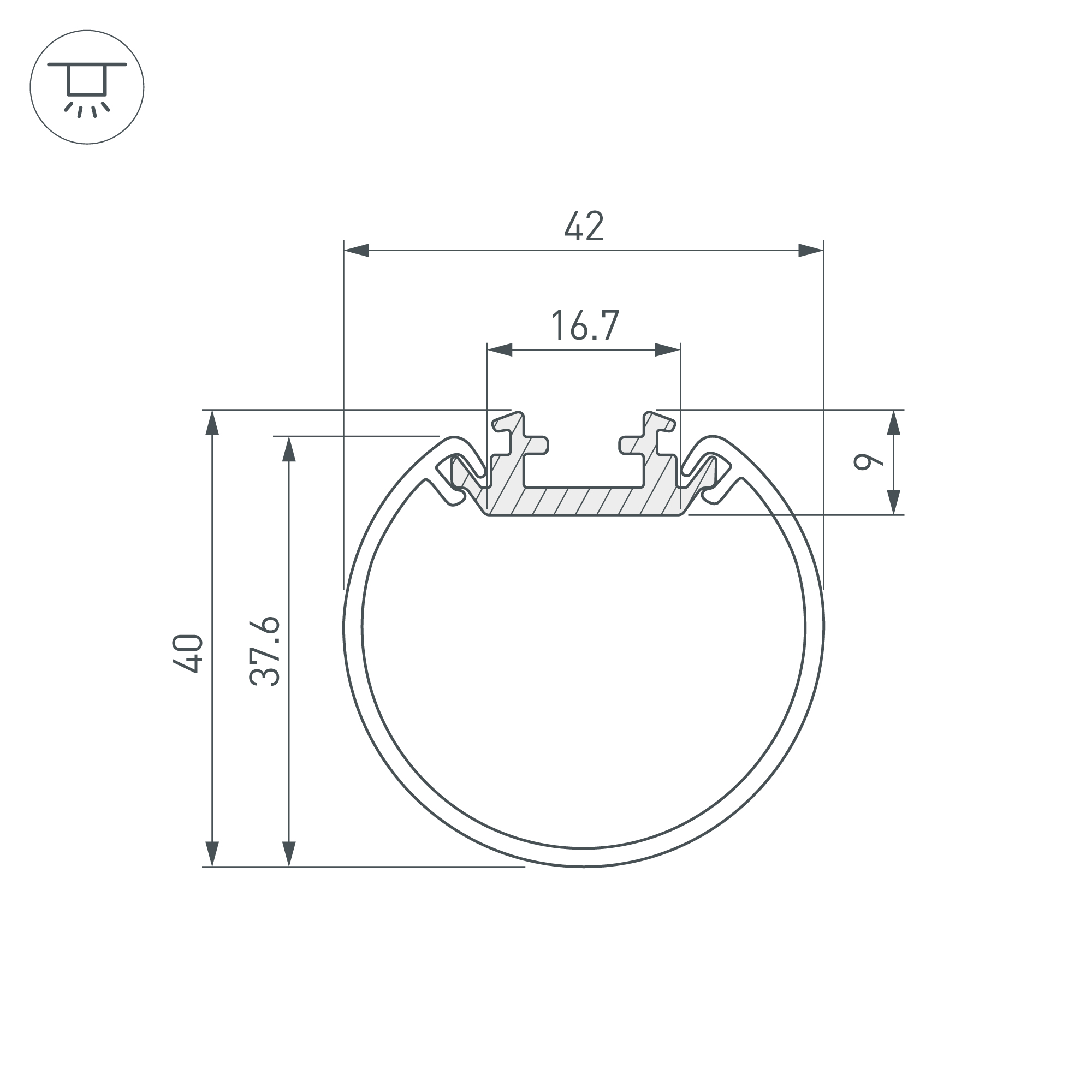 Подвесной профиль из анодированного алюминия для основного освещения. Габаритные размеры профиля с круглым рассеивателем составляют 2000 мм в длину, 40 мм в ширину и 40 мм в высоту. Площадка для установки светодиодных лент позволяет использовать ленту шириной до 16,7 мм. Это обеспечивает гибкость в выборе светодиодных лент и создает потрясающие световые решения.