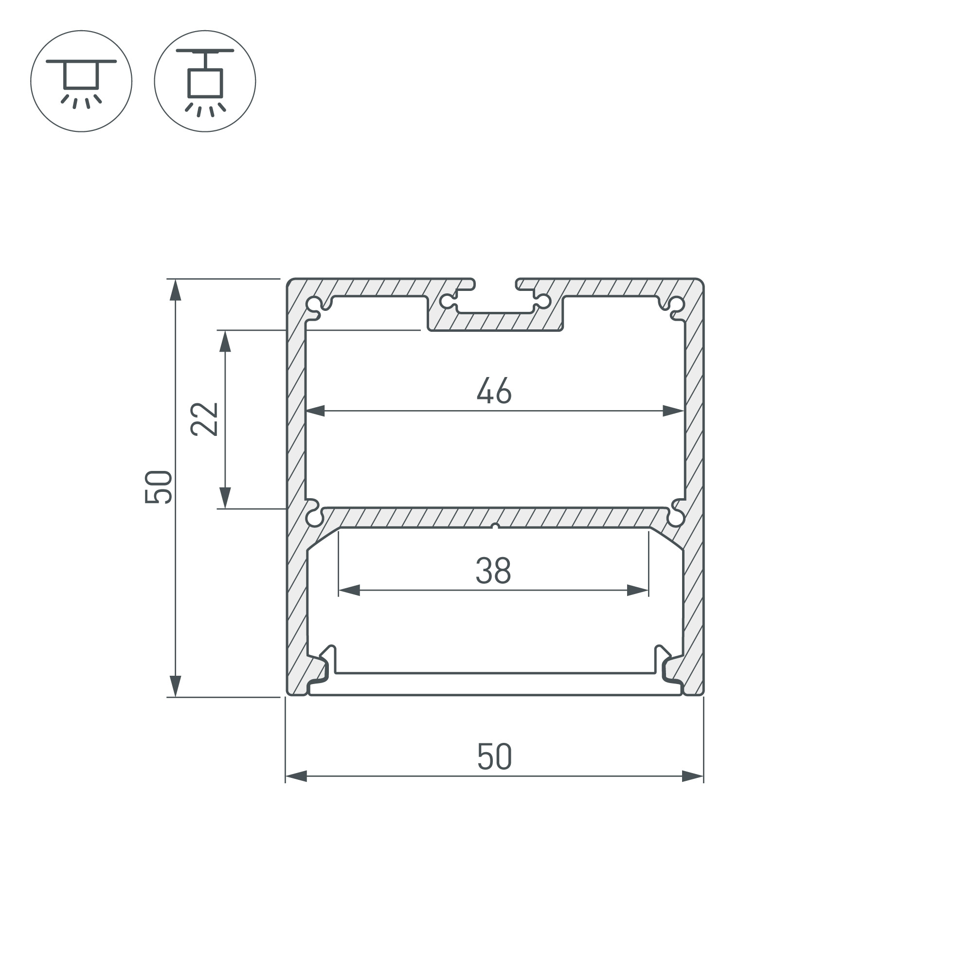 Габаритные размеры (L×W×H): 2000 x 50 x 50 мм. Ширина площадки для ленты 38 мм. Отсек для БП 46 х 22 мм.