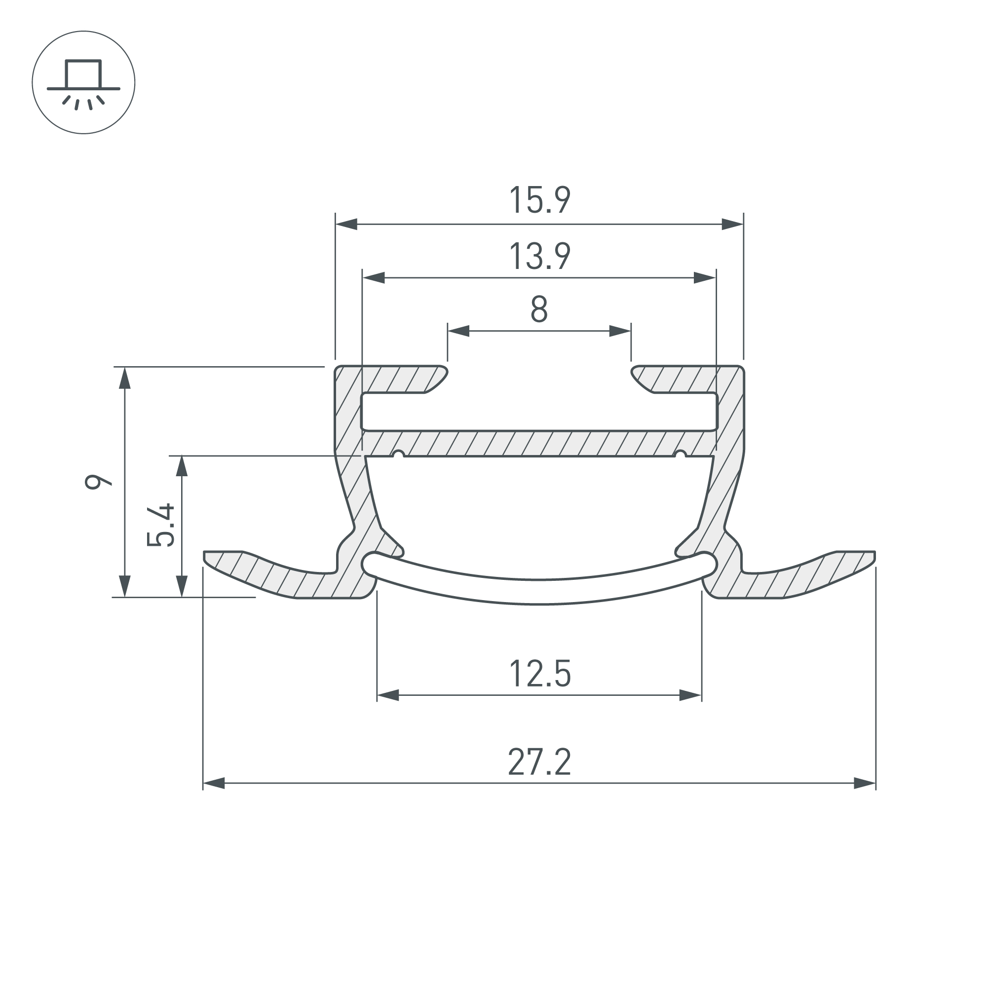 Габаритные размеры (L×W×H): 2000 x 27,2 x 9 мм. Ширина площадки для ленты 13,9 мм. Установка в паз шириной 16 мм.