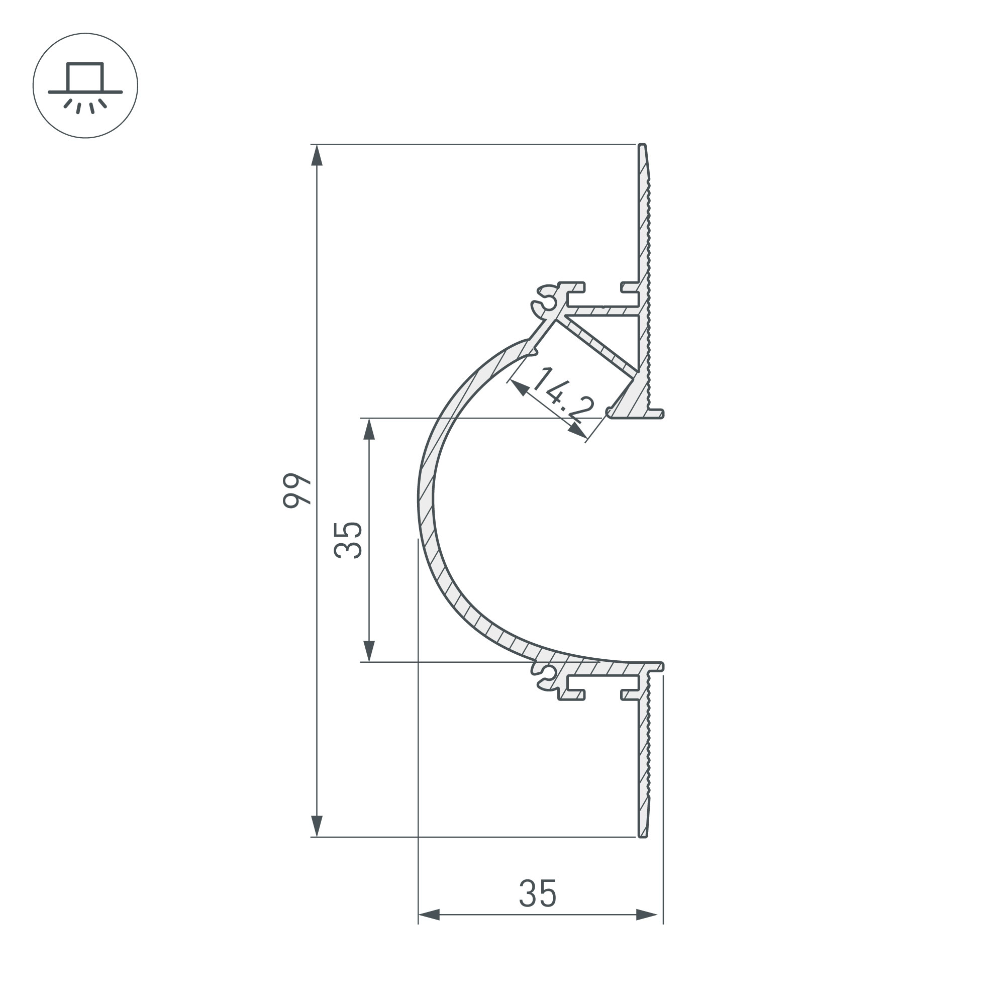 Габаритные размеры (L×W×H): 2000 x 99 x 35 мм. Ширина площадки для ленты 14,3 мм.