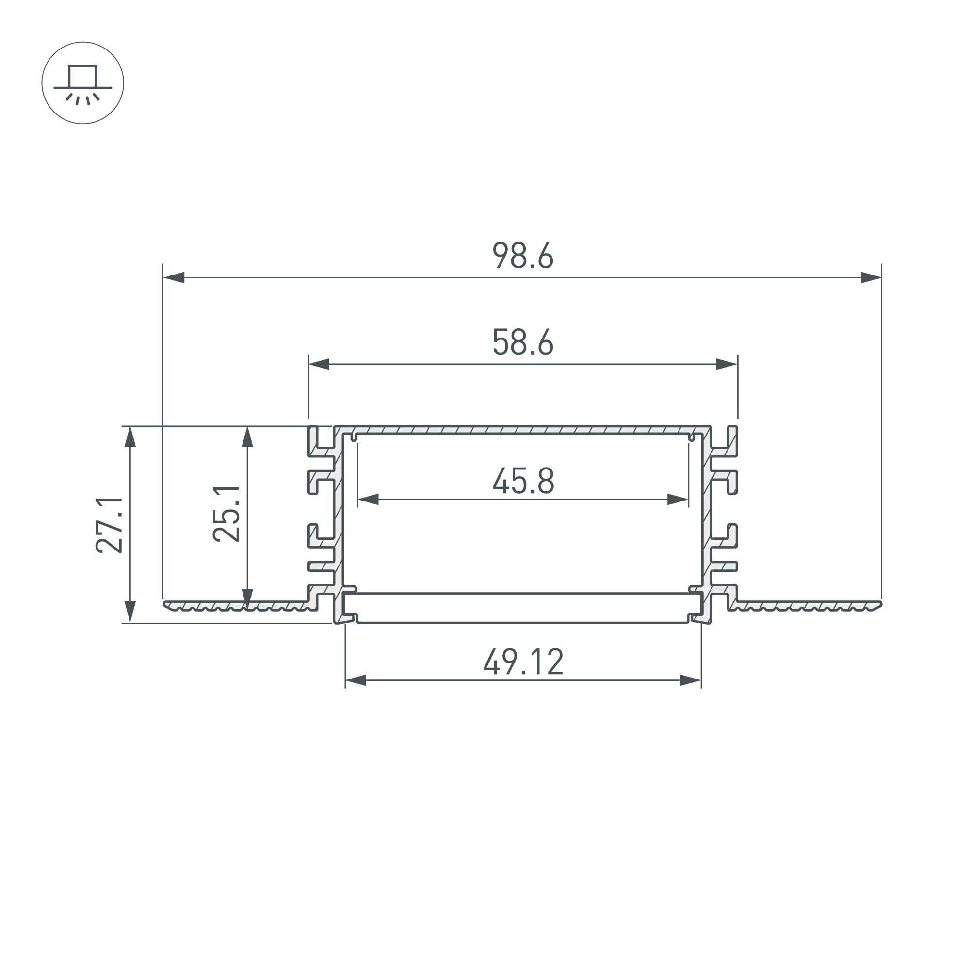 Габаритные размеры профиля составляют 2000 мм в длину, 98,6 мм в ширину и 27,1 мм в высоту. Площадка для установки светодиодных лент позволяет использовать ленту шириной до 45,8 мм и мощностью до 54 Вт/м. Это обеспечивает гибкость в выборе светодиодных лент и создает потрясающие световые решения.