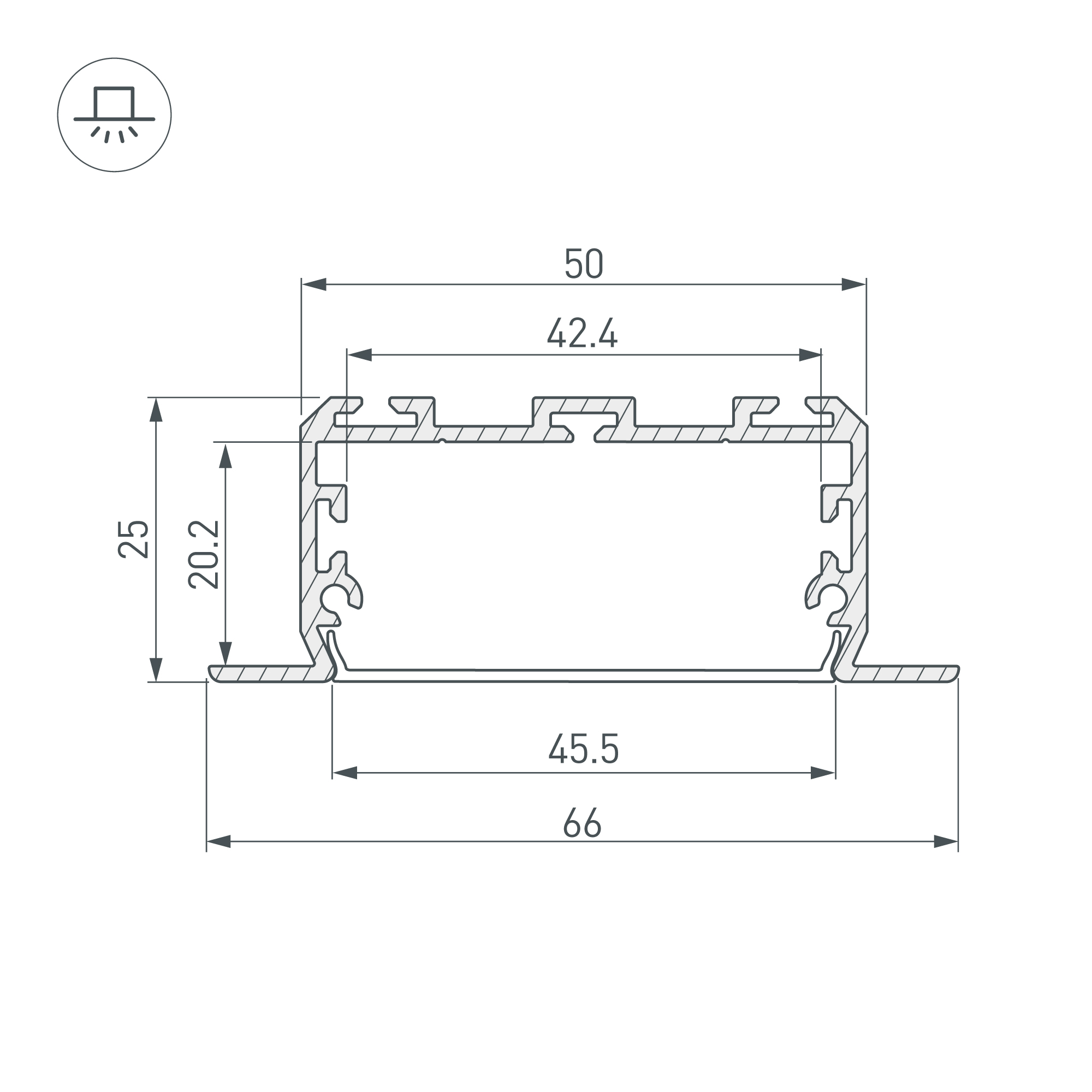 Габаритные размеры (L×W×H): 2000 x 66 x 25 мм. Ширина площадки для ленты 48 мм.