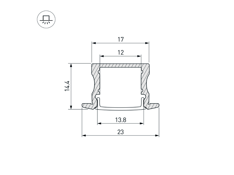 Встраиваемый профиль из анодированного алюминия черного цвета с накладным фланцем для контурной подсветки элементов интерьера. Габаритные размеры профиля составляют 2000 мм в длину, 23 мм в ширину и 14,4 мм в высоту. Площадка для установки светодиодных лент позволяет использовать ленту шириной до 12 мм и мощностью до 19,6 Вт/м. Это обеспечивает гибкость в выборе светодиодных лент и создает потрясающие световые решения.