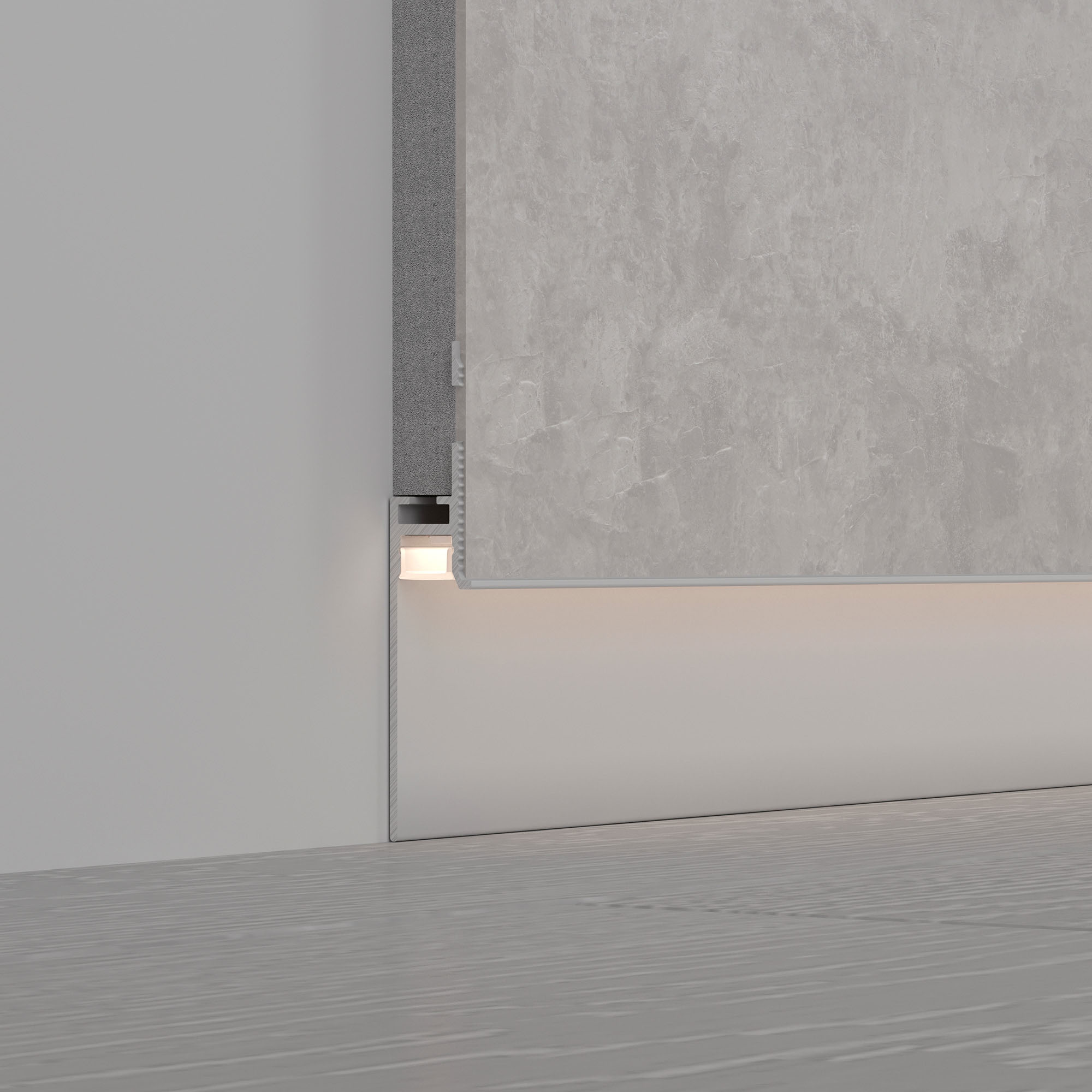 Встраиваемый алюминиевый профиль белого цвета для светодиодных лент и линеек под строительную отделку для создания эффекта парящей стены. Не является плинтусом, используется как декоративная накладка на фальш-стены.
