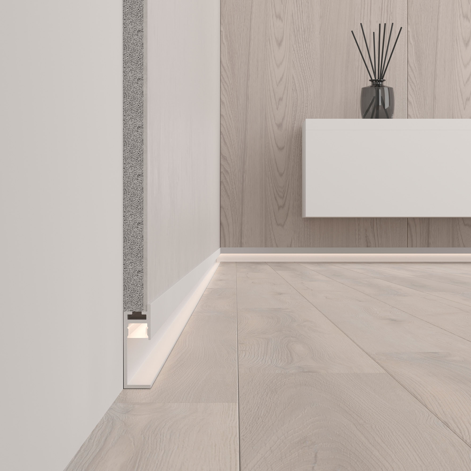 Встраиваемый алюминиевый профиль-плинтус с накладным фланцем белого цвета для создания эффекта парящей стены.