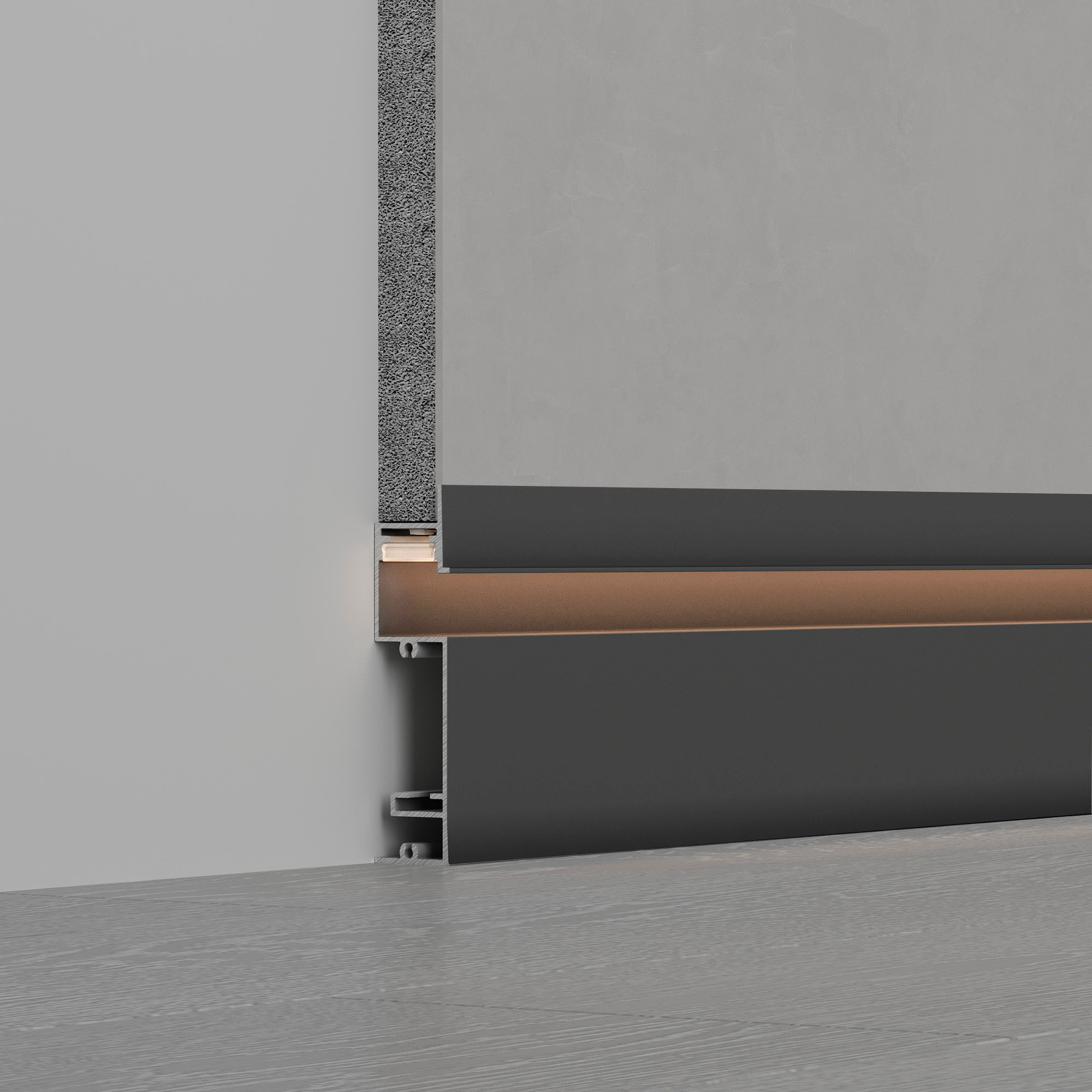 Встраиваемый алюминиевый профиль-плинтус с накладным фланцем черного цвета для создания эффекта парящей стены.