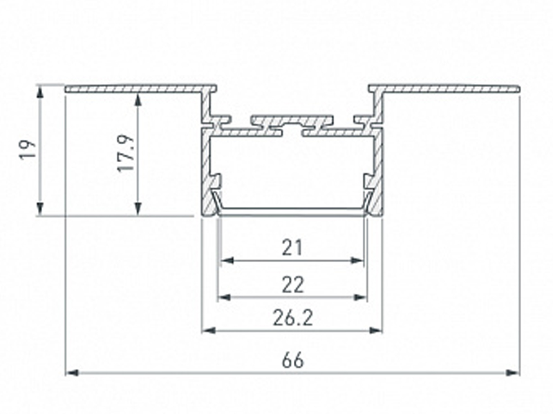 Габаритные размеры (L×W×H): 2000 x 66 x 19 мм. Ширина площадки для ленты 24 мм.