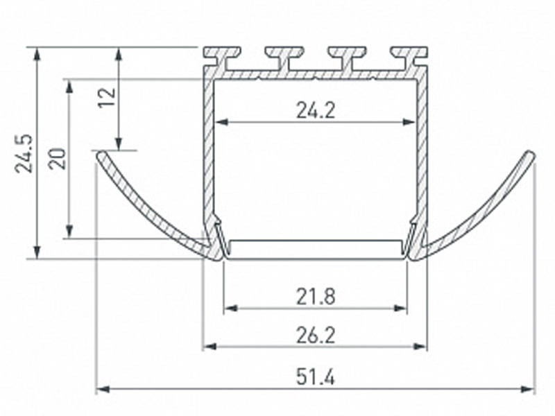 Габаритные размеры (L×W×H): 2000 x 51,4 x 24,5 мм. Ширина площадки для ленты 24,2 мм.