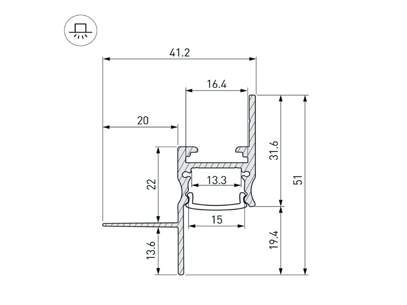 Габаритные размеры профиля составляют 2000 мм в длину, 41,2 мм в ширину и 51 мм в высоту. Площадка для установки светодиодных лент позволяет использовать ленту шириной до 13,3 мм и мощностью до 33 Вт/м. Это обеспечивает гибкость в выборе светодиодных лент и создает потрясающие световые решения.