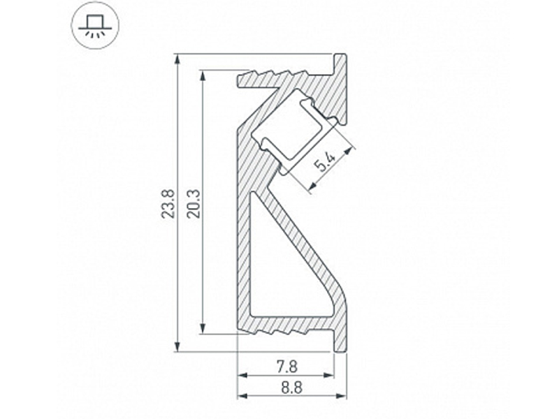 Габаритные размеры (L×W×H): 2000 x 24 x 9 мм, паз для установки 20,3 мм. Ширина площадки для ленты 5.4 мм.