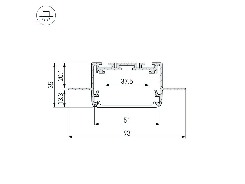 Габаритные размеры (L×W×H): 2500 x 93 x 35 мм, паз для установки 55 мм. Ширина площадки для ленты 37,5 мм.