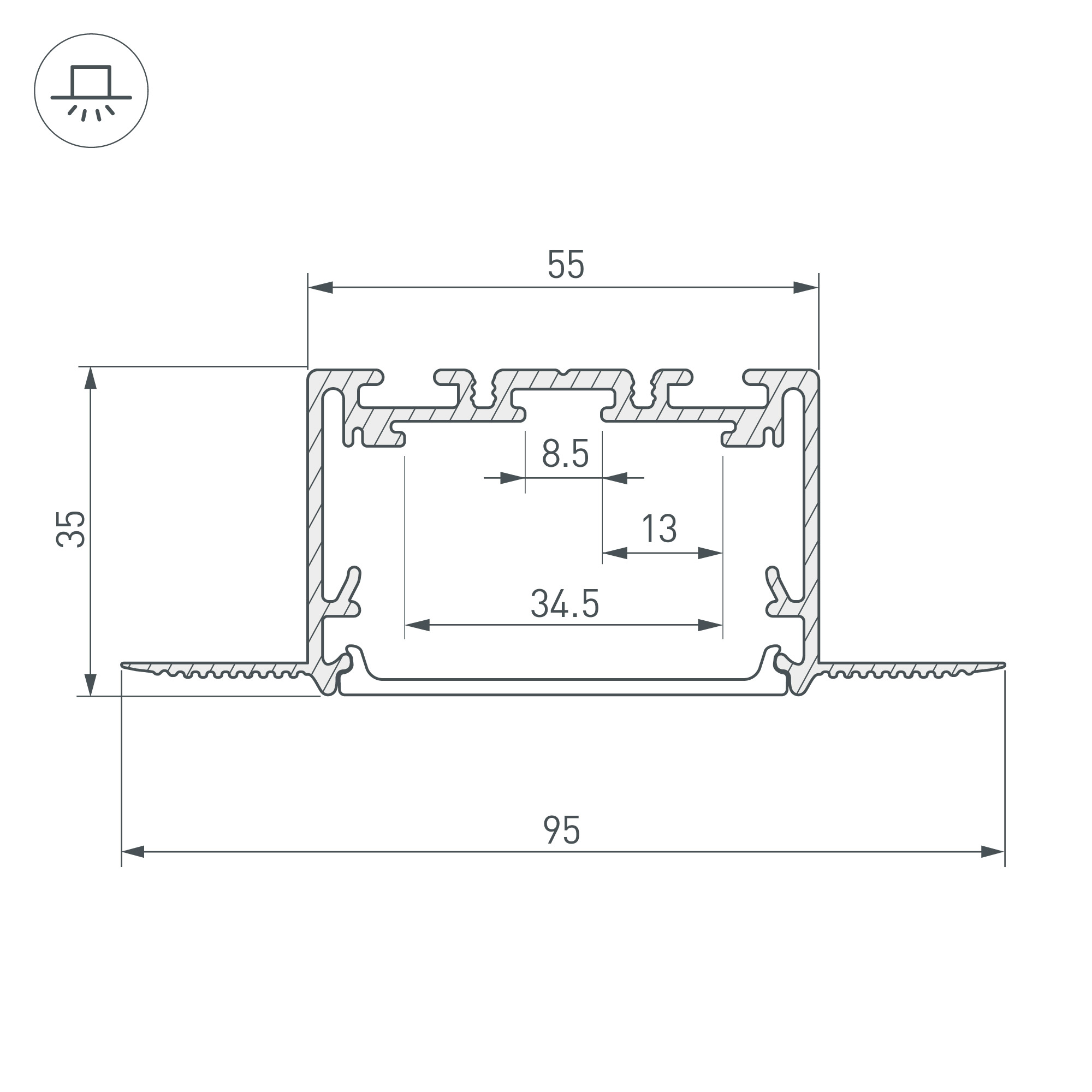 Габаритные размеры (L×W×H): 2500 x 95 x 35 мм, паз для установки 55 мм.