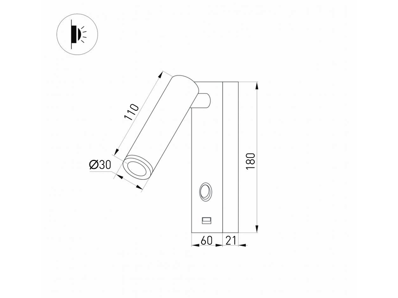 Размер: (ДхШхВ) 180 х 60 х 21 мм, Светоизлучатель Ø30 × 110 мм. IP20.